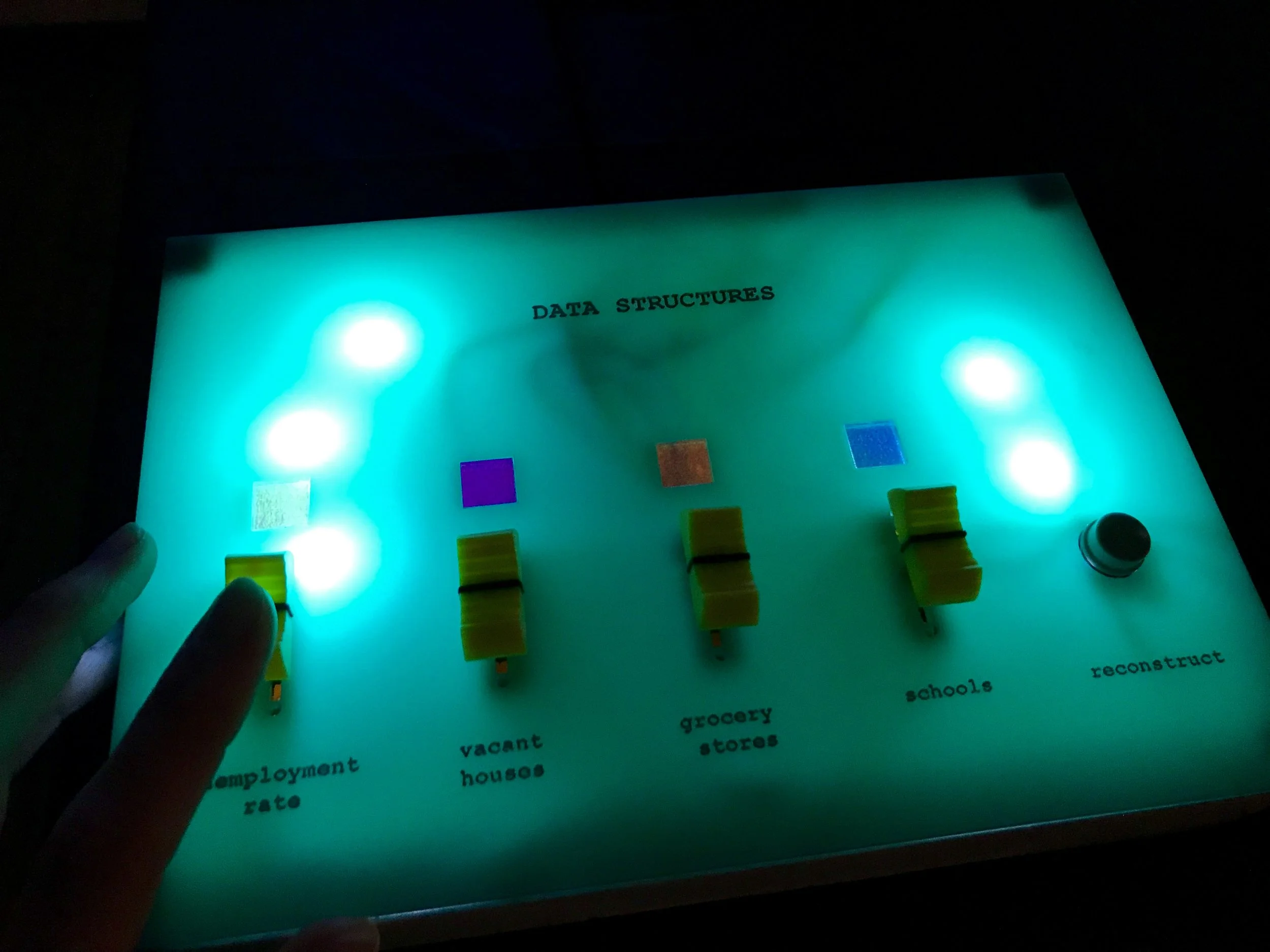 Data Structures is an interactive data visualization. It is made of five 5x5 inch styrofoam cubes, each representing a different neighborhood in Chicago. Using a control box with sliders, viewers can choose four different datasets to project onto the cubes: unemployment rate, vacant houses, grocery stores and schools. Moving the sliders changes the emphasis that is put on each dataset - represented in the piece by the visual weight of each color. Viewers can also re-draw the same data in a different pattern using the “reconstruct” button.